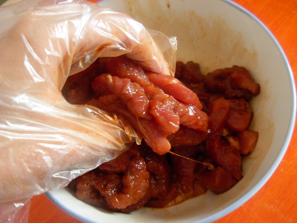 新鮮豬肉洗凈,切小塊,放入料酒、生抽、老抽、白糖、、食鹽、味精調(diào)味,攪拌均勻,腌制2小時(shí),備用。