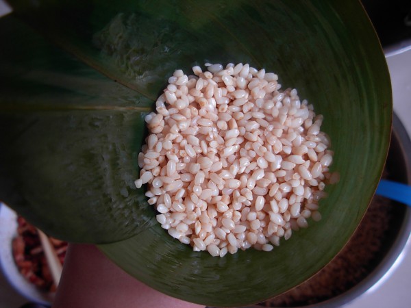 取一片粽葉,將粽葉交錯(cuò)疊好,葉梗在外,粽葉光滑面朝內(nèi),于1/3處折成漏斗狀,填入2匙糯米。
