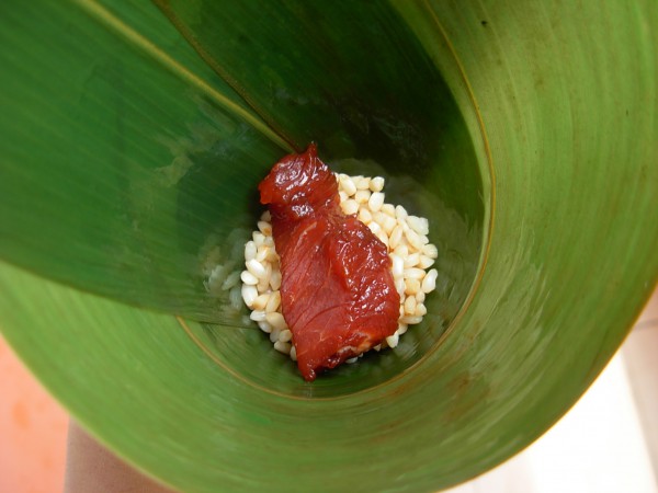 將粽葉的兩端保持交疊,反向折回蓋在糯米上,疊緊,一定要保證不漏米。