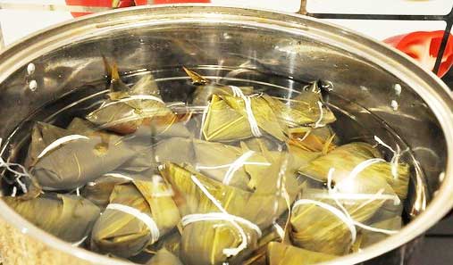 電熱鍋內(nèi)加入足夠的清水,放入包好的粽子,蓋上鍋蓋,打開電熱鍋三個(gè)加熱開關(guān),等水沸騰后,關(guān)掉一個(gè)加熱開關(guān),使用兩個(gè)加熱檔位繼續(xù)煮1個(gè)小時(shí)左右。