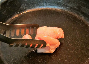 3. 生肥豬肉下鍋,用夾子夾住生肥豬肉,以內圈到外圈的方式呈螺旋狀在鍋內壁不停地擦拭,使溢出的油脂均勻地涂滿整個鍋面。