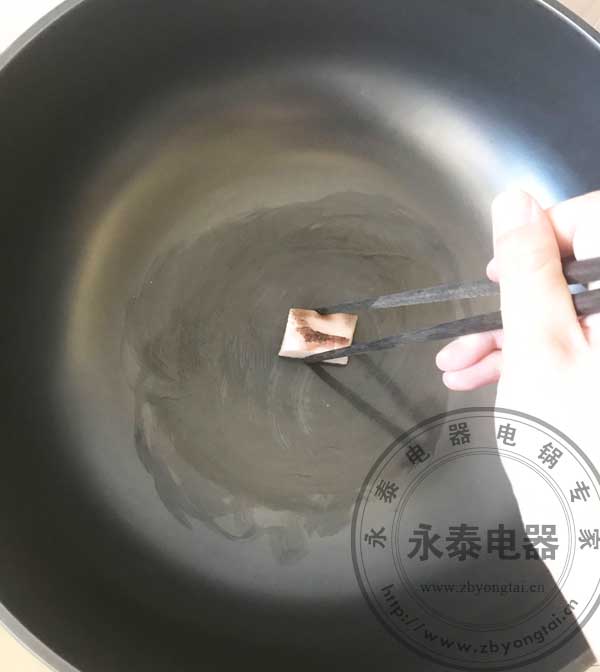 下邊我們開始使用一下,看看好不好用。鐵鍋第一次使用要先開鍋,準備一塊肥豬肉,用筷子夾住生肥豬肉,以螺旋狀在鍋內壁不停地擦拭,油脂均勻地涂滿整個鍋面。重復幾次,大概十幾分鐘即可。