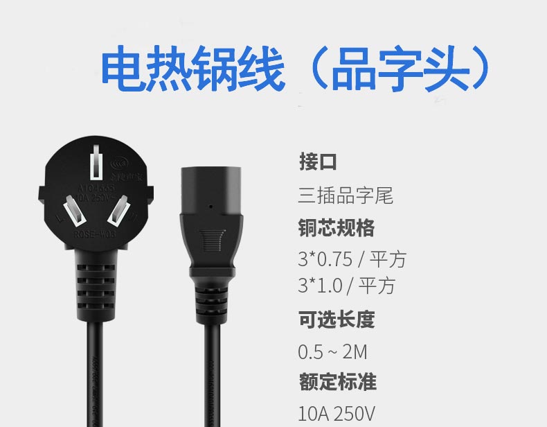 品字頭電熱鍋電源線,國(guó)標(biāo)線材,應(yīng)用廣泛,可用于電熱鍋、電煎鍋、電水壺、電腦主機(jī)等。