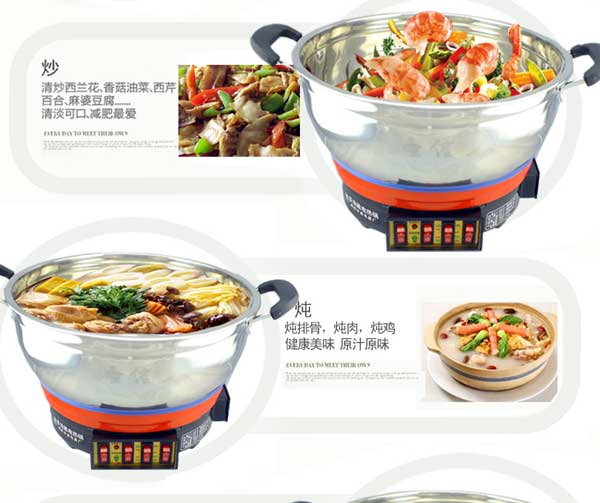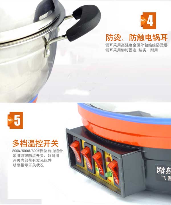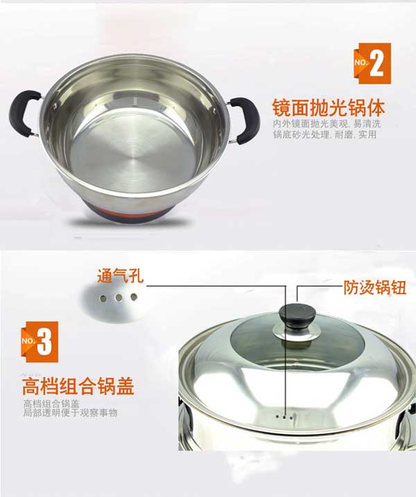 七代大鍋頭電熱鍋,多功能,煎、炸、炒、烙、蒸、燜、涮樣樣精通,鍋體采用不銹鋼制造,蒸籠采用不銹鋼一體成型蒸籠,內部采用三根加熱管獨立加熱,三檔+保溫擋位,內部設有溫控器,可有效防止干燒導致電熱鍋的損壞,結實耐用,美觀實用。